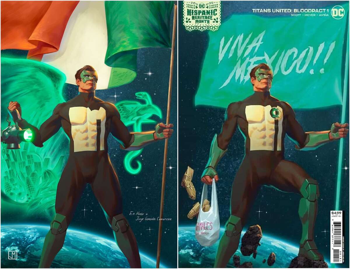 The kicker is the Green Lantern cover which was not supposed to be released but it did! Illustrator Jorge Molina tweeted the unfinished cover he created for Hispanic Heritage Month. In this version you can see it truly is an homage to Mexican culture. It wasn’t released due to unknown legal reasons. However, in the image DC released (you can see it on this post’s cover), Green Lantern is holding a bag of tamales… a bag of tamales!